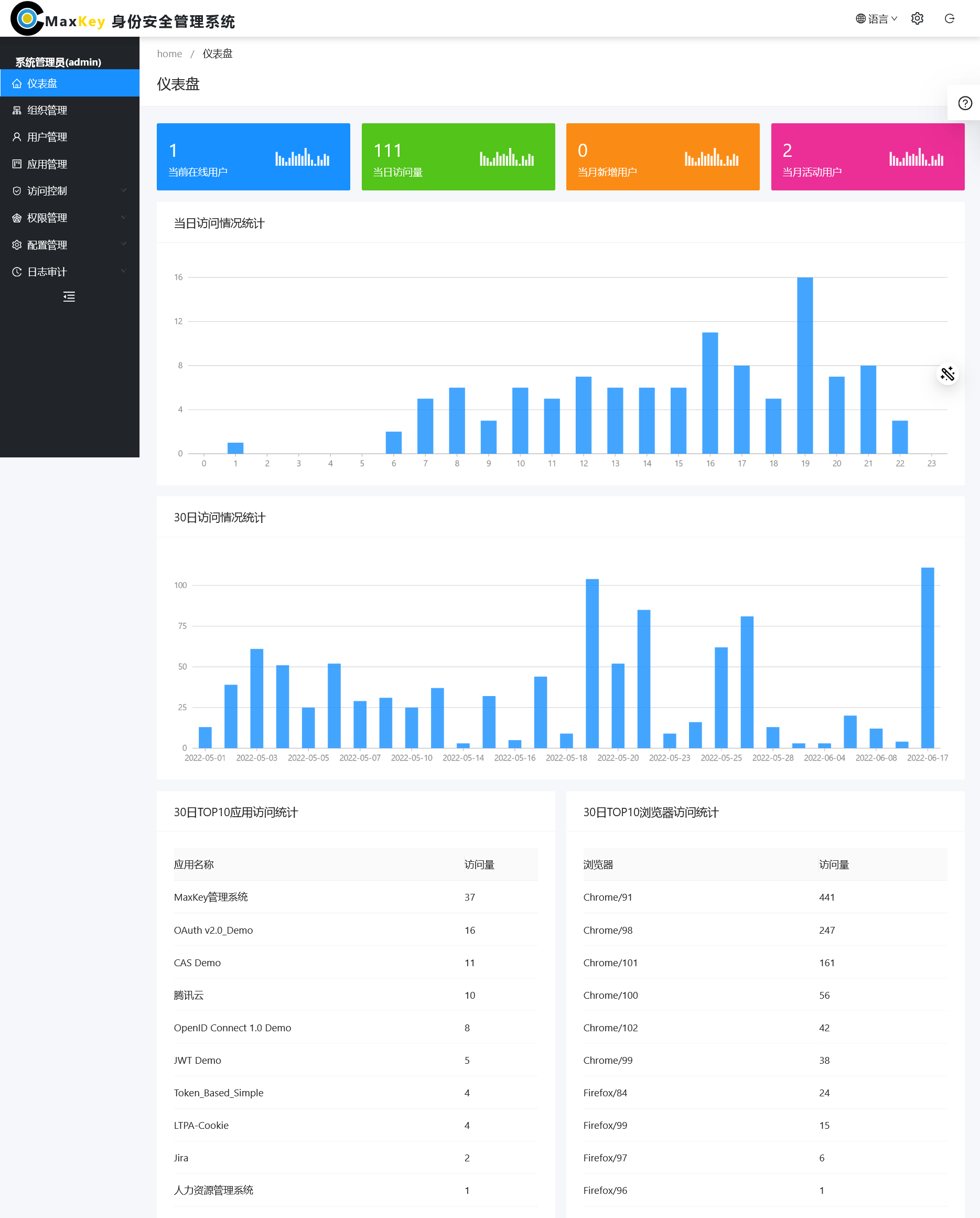 Maxkey Single Sign On System, which means the Maximum key, Leading-Edge IAM Identity and Access Management Product , Support OAuth 2.x/OpenID Connect, SAML 2.0, JWT, CAS, SCIM and other standard protocols, and provide Secure , Standard and Open Identity management (IDM), Access management (AM), Single Sign On (SSO), RBAC permission management and Resource management.